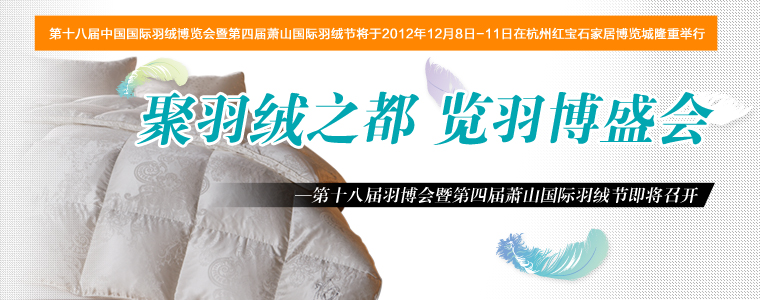 由中國羽絨工業協會和杭州市蕭山區人民政府主辦,蕭山區新塘街道辦事處以及浙江省羽絨行業協會承辦的第十八屆中國國際羽絨博覽會暨第四屆蕭山國際羽絨節(以下簡稱“羽博會”)將于2012年12月8日-11日在杭州紅寶石家居博覽城隆重舉行。
