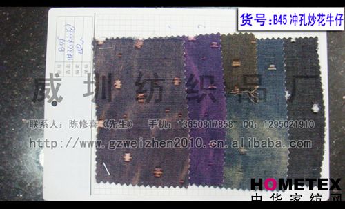 幅寬:150cm 品名:滌棉牛仔 密度:64*47 貨號:B45沖孔炒花 重量:* 具體用途:休閑服、工作服、褲裝、時裝 別名:B45沖孔炒花 成分及含量:65%棉,35%滌 主要用途:服裝用布 ======================================================================= 以上產品全部現貨供應,可隨時提供樣布卡和現貨,隨時發貨。所有產品全部是廠家直銷價,我們承諾:以超低利潤營銷,我 們只求銷售量。為保證您的利益,我司建議您在采購前先確認我們的品質樣與顏色樣后再拿大貨,期待與您的真誠合作。因產 品種類較多,具體參考未盡詳盡,如有需要,請您與我們聯系。    瑞豐紡織(中大旗艦店)坐落于國內最大的紡織面料產業中心—廣州中大,是一家專業銷售面料的廠家直銷商。主要經 營產品有:全棉凈色、仿記憶絲面料、全棉(TC)色織等,面料品種花達上千余種,所有產品全部現貨經營。   我們面料的品質來源于:1、采用國內外優質的原材料;2、使用精良的生產工藝和設備;3、完善的生產質量管理體系。我 們具有開發和創新品種的強烈意識和優越條件,并根據客戶需求與市場變化時時推出潮流面料。憑著多年的專業行業經驗,根 據客戶需求,不論客戶在全國任何地方,只要提供小樣,就可在一兩天時間內輕松獲得所需面料的信息。 批發說明供應商支持混批 。 ============================================================= 有意請加QQ:1295021910或電話聯系。 公司名稱:威圳紡織品廠 聯系人:陳修喜先生 手機:13650817858 網址:http://www.gzweizhen2010.cn.alibaba.com =============================================================