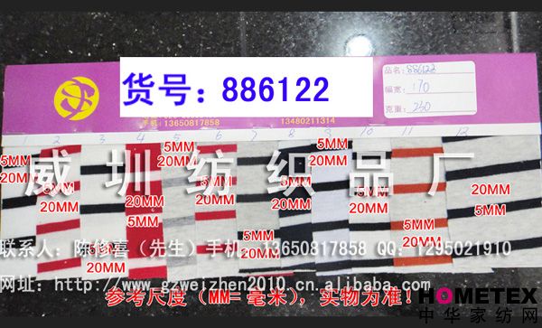 織物組織:色織 幅寬:170 密度:240T 貨號:886122 具體用途:襯衫、休閑服、棉服、褲裝、內衣、睡衣、時裝 別名:886122 成分及含量:滌棉 主要用途:服裝用布 紗支:32 ============================================================= 以上產品全部現貨供應,可隨時提供樣布卡和現貨,隨時發貨。所有產品全部是廠家直銷價,我們承諾:以超低利潤營銷,我們只求銷售量。為保證您的利益,我司建議您在采購前先確認我們的品質樣與顏色樣后再拿大貨,期待與您的真誠合作。因產品種類較多,具體參考未盡詳盡,如有需要,請您與我們聯系。    瑞豐紡織(中大旗艦店)坐落于國內最大的紡織面料產業中心—廣州中大,是一家專業銷售面料的廠家直銷商。主要經營產品有:全棉凈色、仿記憶絲面料、全棉(TC)色織等,面料品種花達上千余種,所有產品全部現貨經營。   我們面料的品質來源于:1、采用國內外優質的原材料;2、使用精良的生產工藝和設備;3、完善的生產質量管理體系。我們具有開發和創新品種的強烈意識和優越條件,并根據客戶需求與市場變化時時推出潮流面料。憑著多年的專業行業經驗,根據客戶需求,不論客戶在全國任何地方,只要提供小樣,就可在一兩天時間內輕松獲得所需面料的信息。 批發說明供應商支持混批 。 ============================================================= 有意請加QQ:1295021910或電話聯系。 公司名稱:威圳紡織品廠 聯系人:陳修喜先生 手機:13650817858 網址:http://www.gzweizhen2010.cn.alibaba.com =============================================================